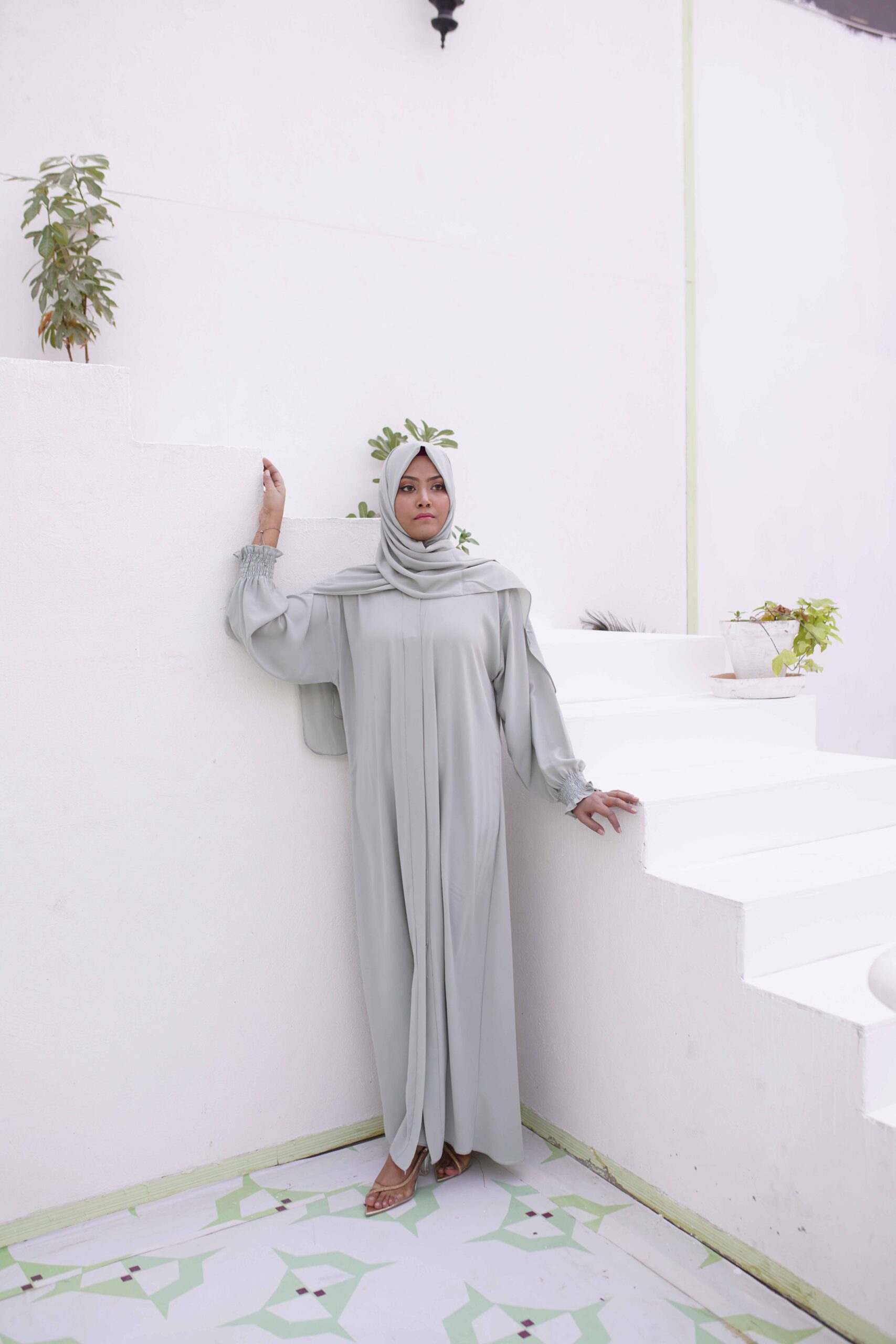 Introducing The Mint button down open Abaya, your new go-to place for effortless style in every season featuring stylish elasticated cuff sleeves. It comes with soft Georgette matching Hijab making it perfect all in one outfit. Stud fastened buttons provided for easy opening.